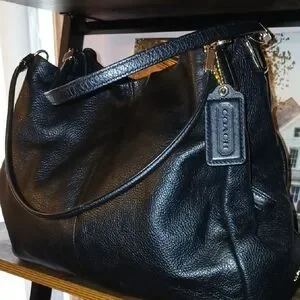 Elegant and versatile, this Coach black leather bag is perfect for any occasion. Crafted with high-quality materials, it offers both style and functionality. Clean inside and out. no call outs 13 x 12