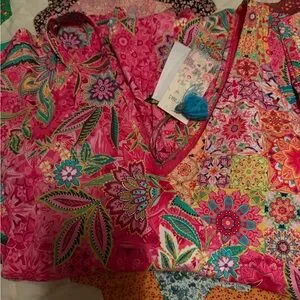 Colorful floral bathingsuit by Johnny Was. Features bright pink and green patterns.