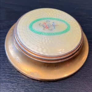 Antique Guilloche Enamel Floral Bouquet Brass Vanity Powder Box Jewelry Box