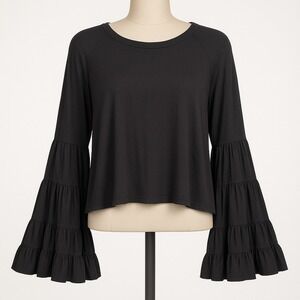Black long sleeve top with dramatic tiered ruffle bell sleeves. This chic top offers a flattering silhouette with its flowing design and eye-catching sleeves. Perfect for a casual day out or a stylish evening ensemble.