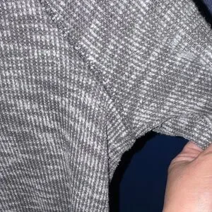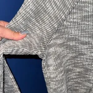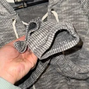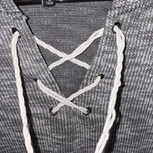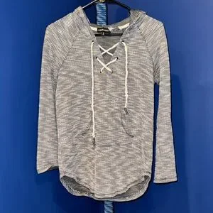 Casual grey and white striped hoodie with lace-up front. Perfect for everyday wear.