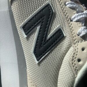 Elevate your look with these stylish New Balance sneakers. Cream and black design for versatile wear.