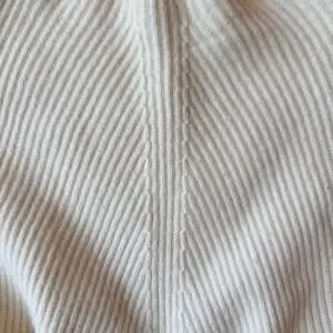 Babaton Chalmers Sweater in Ivory, Women's Size XS. This elegant piece is crafted from a luxurious blend of 38% wool, 30% viscose, 20% linen, and 12% nylon, offering a unique texture and comfortable warmth. Featuring a sophisticated ribbed knit pattern with diagonal architectural detailing at the front and a classic crew neck. The sweater has a slight high-low curved hem for a flattering, modern silhouette. Perfect for layering in transitional weather or as a cozy office staple. Excellent pre-owned condition with no stains, holes, or significant pilling. Hand wash cold and dry flat.
