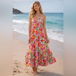 Abel the Label strapless floral maxi dress is a dreamy, romantic statement piece with vibrant oversized florals and a flattering smocked bodice that hugs comfortably while creating shape. The tiered ruffle hem adds movement and drama, making it perfect for warm-weather styling and special occasions.