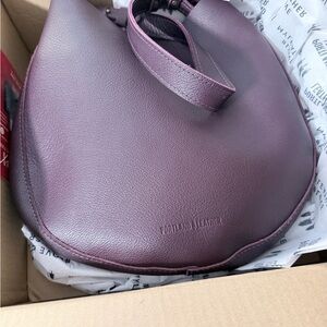 Real leather shoulder bag bought directly from Portland Leather online. When this style came out, I bought both sizes, and I like the medium best for my daily use. This bag holds more than you think it would without bulk or being heavy. The strap will detach so you could add an after market strap, if you would like to carry crossbody . There are no imperfection in the leather and pebbling is even. I carried it just a couple of times to try it out. It has been in the original box with tissue paper in my closet since.