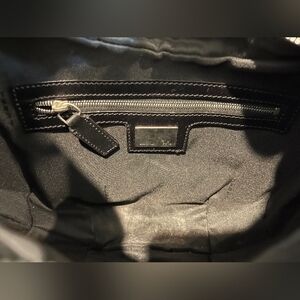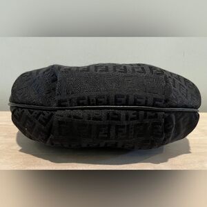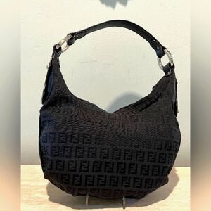 If you are a Fendi lover, this is a great, rare hobo bag. It has black Fendi logo fabric with leather trim & silvertone metal hardware. It has been lovingly cleaned & conditioned & is in excellent shape. It is very clean with no stains, tears, or odors. The Fendi nameplate inside has some rub marks on it from carrying items inside. Overall, it's a beautiful bag.