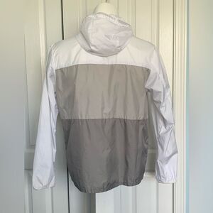 Stylish Eddie Bauer windbreaker jacket in white and gray. Perfect for casual outings.