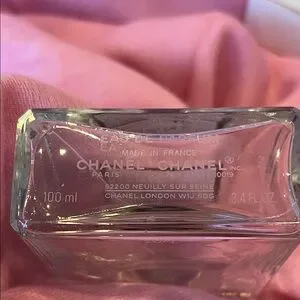 Elegant Chanel perfume bottle 3.4 fl oz capacity. Two 0.7 fl oz twist atomizers. All empty.