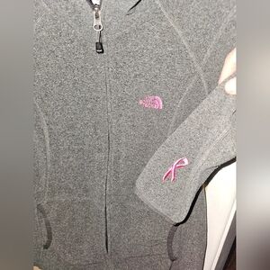 This is in good shape. It is a North Face Breast Cancer awareness zip up. It is a size L