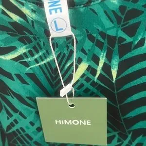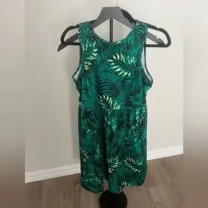 Sleeveless dress with a vibrant green leaf pattern. Elastic waist. Smooth comfortable Material. Perfect for a casual outing.
