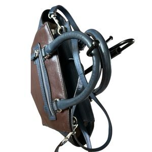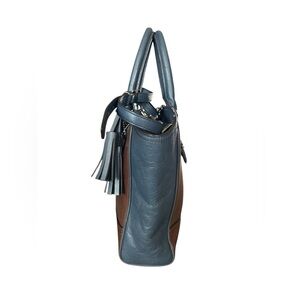 Stylish Coach shoulder bag in brown and blue. Features dual handles and a detachable strap. Perfect for versatile wear.