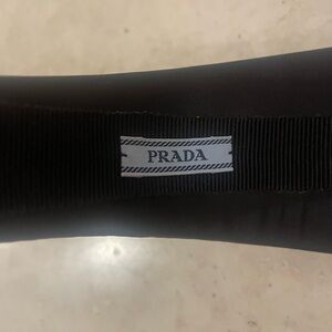 Chic black headband with iconic Prada logo. Adds elegance to any outfit.