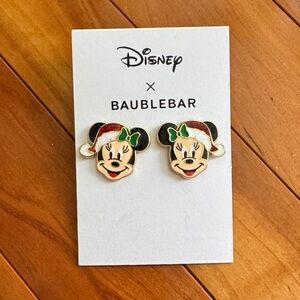 Charming Minnie Mouse earrings by BaubleBar. Features festive red, green, and black details. Ideal for holiday celebrations.