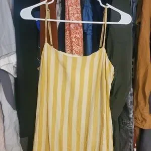 Chic midi dress with mustard stripes. Features a square neckline and spaghetti straps. Perfect for casual outings.