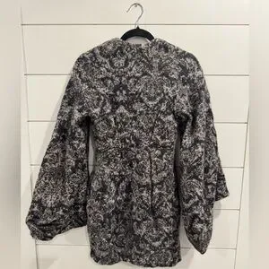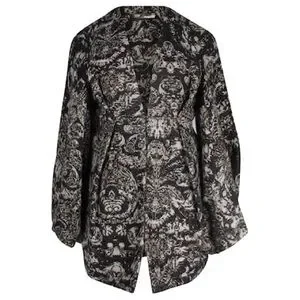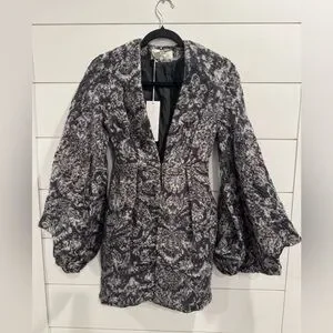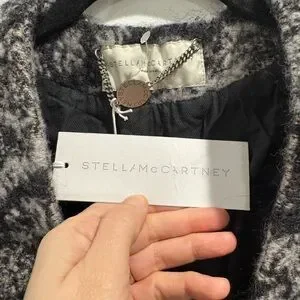 An elevated take on the classic coat, this piece from Stella McCartney is made from a richly-patterned gray wool blend that has wide tucks at waist on the front and back. The coat features over-sized kimono sleeves and a deep v-neck, as well as a center front hook closure.