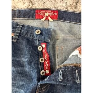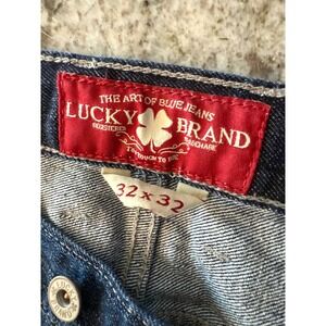 Classic dark wash denim jeans. These Lucky Brand jeans feature a button fly and a straight leg fit. The iconic Lucky Brand clover logo is visible on the red tab and pocket detail. Perfect for everyday wear, casual outings, or a relaxed weekend look.