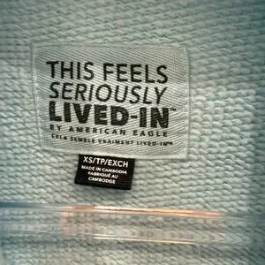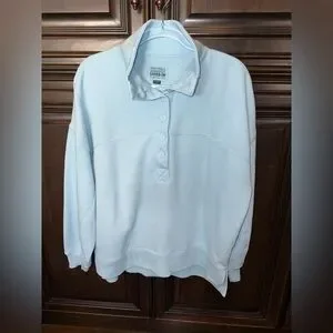 Cozy and stylish light blue sweatshirt. Features a classic collar and button-up front. Ideal for casual wear.