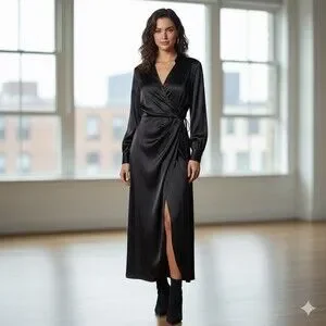 Additional Details: Long Sleeve, Petites, Satin, Maxi, Single Button Closure, Wrap Dress, Retail $120