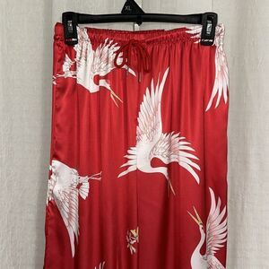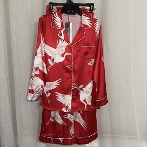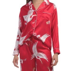 DALIA MACPHEE M & LβRed White Satin Ibis Bird Print Long Sleeve Long Pant PJ Set