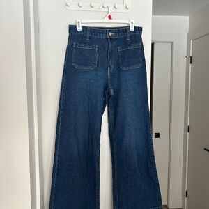 Stylish dark blue flare jeans. Comfortable and chic. Perfect for versatile wear.