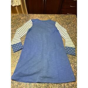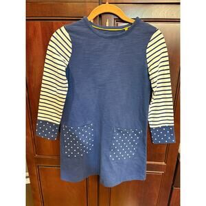 Mini Boden girls navy dress with white polka dots and stripes. 100% cotton. Size 9-10. New with tags.