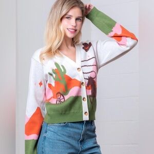 Embrace vibrant style with this colorful women's cardigan sweater. Featuring a playful mix of green, pink, orange, and cream, this sweater adds a pop of color to any outfit. Perfect for casual outings or cozy days at home.