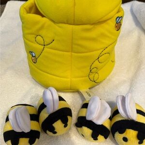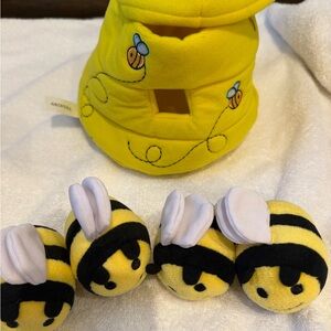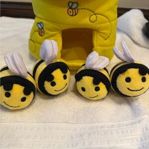 Adorable yellow bee plush toy set. Includes four bee toys with a matching hive.