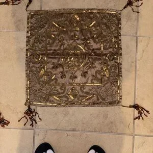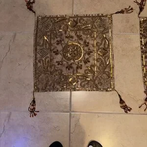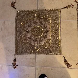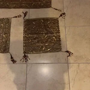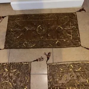 Elegan set with intricate embroidery. Features rich brown and gold tones. Perfect for adding a touch of luxury to any space.