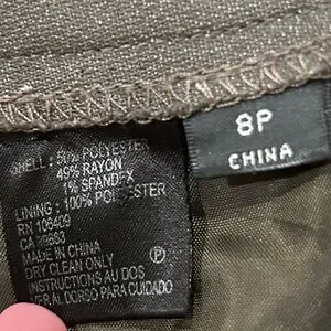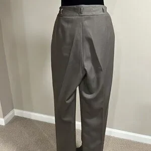 Suit is a Khaki with a bit of olive tone. The Jacket is fully lined with a pink, creme and olive print. There are two buttons in the front and two pockets. The pants are fully lined in a olive shade with zipper, two hooks and a button. There are also belt loops but it did not come with a belt. Pants measure 39" from waist to bottom.