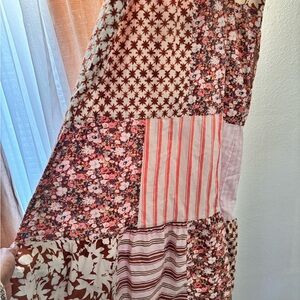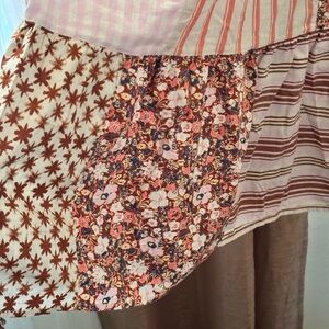 Chic dress with a blend of floral, gingham, and striped designs. Features pink and cream hues. POCKETS!