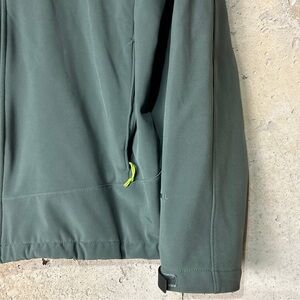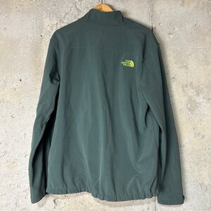 The north face Apex bionic, soft shell, zip up jacket in gray blue green and bright green accent zippers. Excellent pre-loved condition.