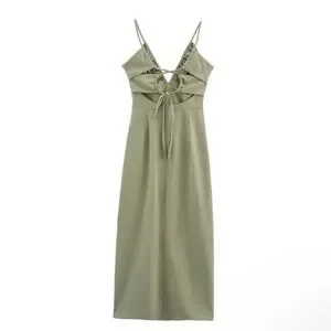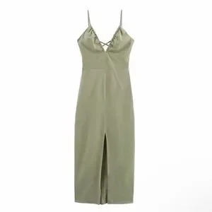 Elegant olive green dress with spaghetti straps and front slit. Perfect for any occasion.