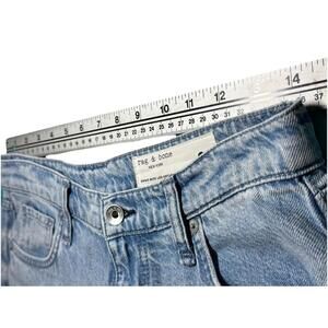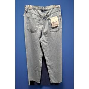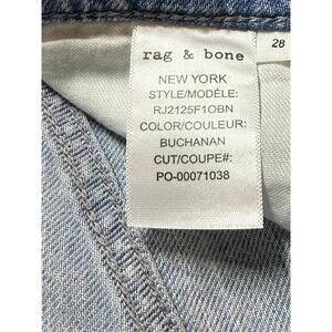 The product is a pair of NWT Rag & Bone women's jeans in size 28, made in the USA. They are a classic denim style in a solid Buchanan Blue color with a high rise and a wide-leg fit. The jeans feature a zip closure, 5-pocket design, and are machine washable. The fabric is a comfortable cotton blend with a medium wash, perfect for everyday wear. The brand is known for its quality craftsmanship and this pair of jeans is no exception.