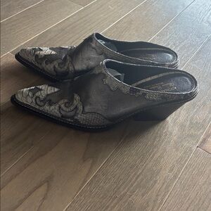 Step out in style with these chic black and gray mules. Perfect for any occasion, these shoes offer both comfort and elegance. Barely worn.