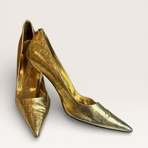 Rocawear Gold Monogram Embossed Pointed Toe Pumps Size 10 Y2K Mob Wife