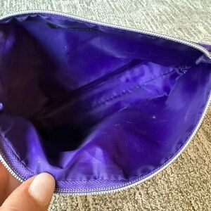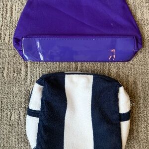 Set of two Lancôme cosmetic bags. One is deep purple with heart accents. The other is a navy blue and white striped design.