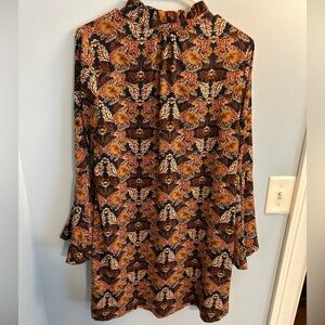 Umgee Women’s Dress Size Small Gold Brown Navy Floral V-Neck Ruffle Bell Sleeve