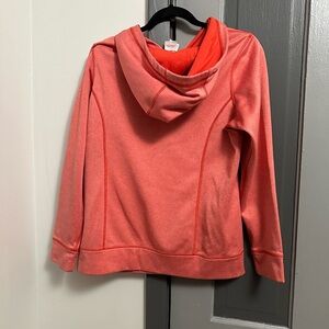Vibrant coral hoodie with front logo. Soft and comfortable. Ideal for casual outings.