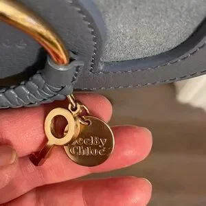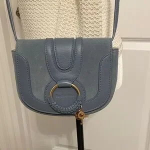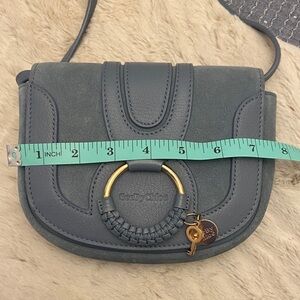 Hana crossbody bag in grained leather and suede cowhide with an adjustable leather strap. A large signature feminine braided O-ring features a gold key and the signature See By Chloe gold medal. Fold-over flap with magnetic press-stud closure. Card slot in interior and cotton twill lining in beige. In excellent, like new condition! Comes with authenticity card.