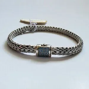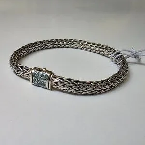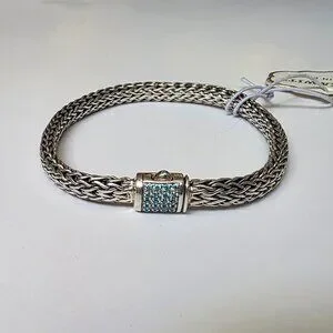 Blue topaz stones take center stage on this intricately linked chain bracelet. Crafted in sterling silver, this bracelet is the perfect blend of luxury and style, making it a standout piece for any occasion. Perfect for stacking or wearing solo, it offers a versatile accessory that complements both casual and formal looks.