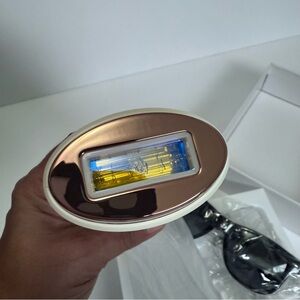Sleek rose gold hair removal device. Includes accessories for easy use.