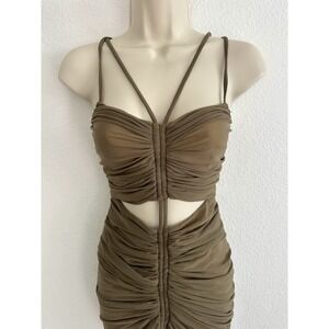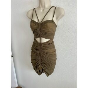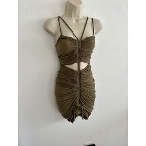 Michael Costello x Revolve Danika Mini Cocktail Dress - Olive Green Stretch Ruched Mesh with Cutouts & Strappy Details - Women's Size XS