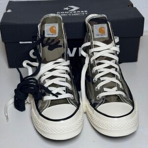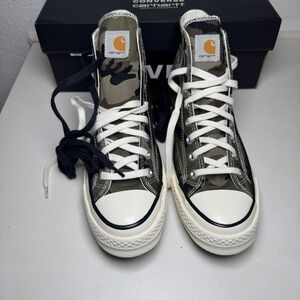 Own a piece of streetwear history with these iconic Carhartt x Converse Chuck 70 high-top sneakers. The unique camouflage patchwork design offers a rugged yet stylish aesthetic, making a bold statement with every step. Lace up in comfort and confidence, knowing you're sporting a collaboration that blends durable workwear heritage with timeless sneaker design. These are perfect for making a statement on city streets or adding a distinctive touch to your casual weekend outfits.