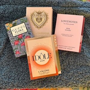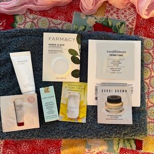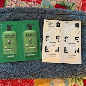 New Blue furry cosmetic bag from Ulta with four perfume samples, seven cosmetic samples, two shampoo samples, and two conditioner samples.