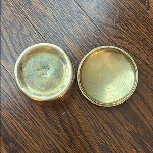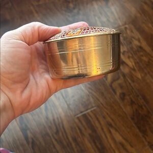 Round, brass decorative box with intricate red and gold phoenix design. It is beautiful and in great condition. It would be a great addition to your collection.