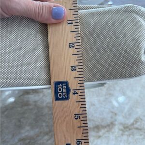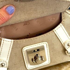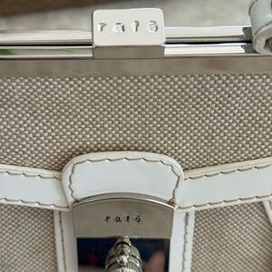This elegant mini bag by Rafe features a sophisticated cream and white color scheme, highlighted by its structured design and polished finish. The bag's refined aesthetic makes it an ideal accessory for any stylish occasion. Has one main opening and then the front lock turns to get into a thin secure pocket. It is so sweet. Minimal signs of use. May have discoloration, hardware scratches. I did not note any odor and I have Sensitive nose. pleased see pictures for details and measurements. I am accepting reasonable offers.