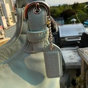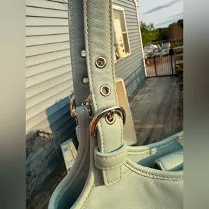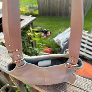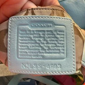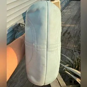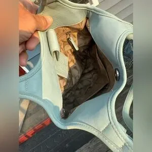 Gorgeous 1993 ice blue Coach shoulder bag with Coach tan signature patterned interior. Some small Light marks are on the exterior of the purse, but are all shown in pictures. Please let me know if you have questions. Beautiful interior!