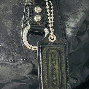 Features Coach signature jacquard fabric with black leather trim, dual top handles, detachable shoulder strap for crossbody or shoulder wear, secure top zip closure, signature Coach hangtag, and polished silver-tone hardware. Interior includes fabric lining with zip pocket and multifunction slip pockets to keep essentials organized.