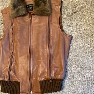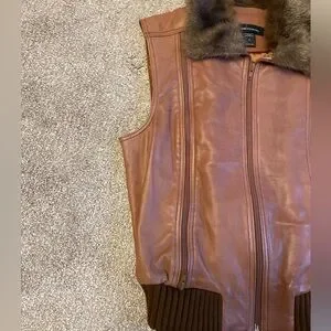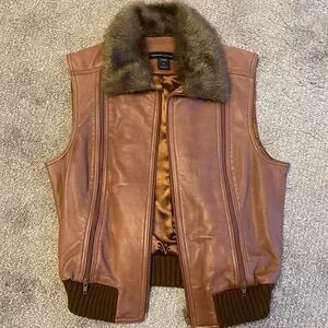 Chic brown leather vest with soft faux fur trim. Ideal for stylish layering.