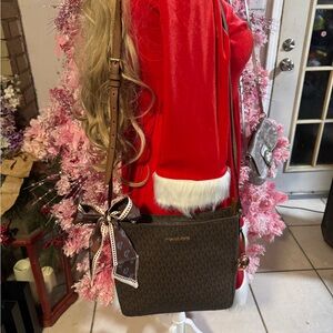 Chic crossbody with signature monogram design. Features elegant brown tones and stylish bow accent.